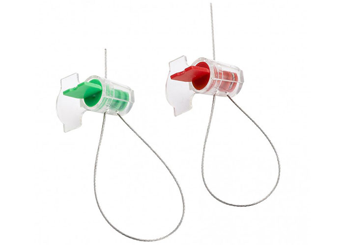 仪表封条由塑料锁体和金属丝组成。该封条的金属丝一段连接在锁芯上,另一端穿过锁芯。锁芯和锁套两个部分是聚碳酸酯材质。